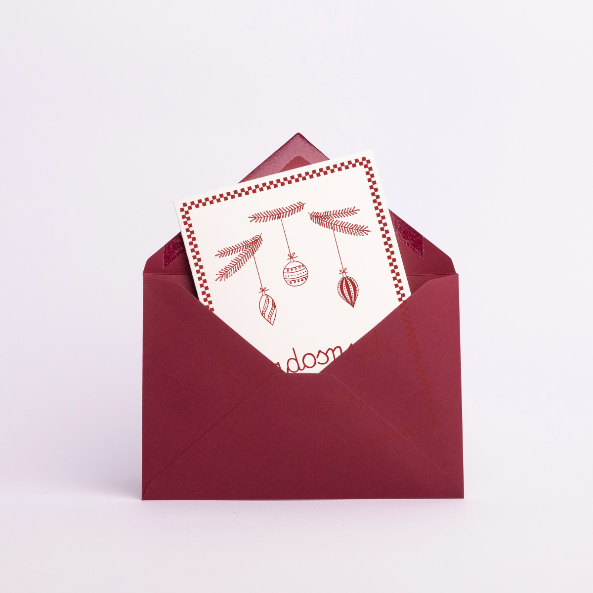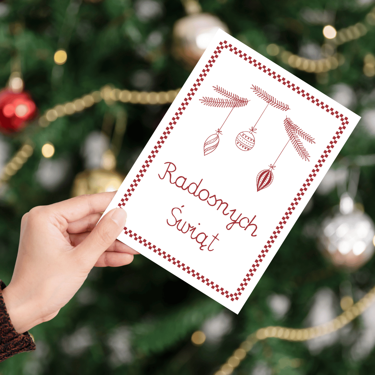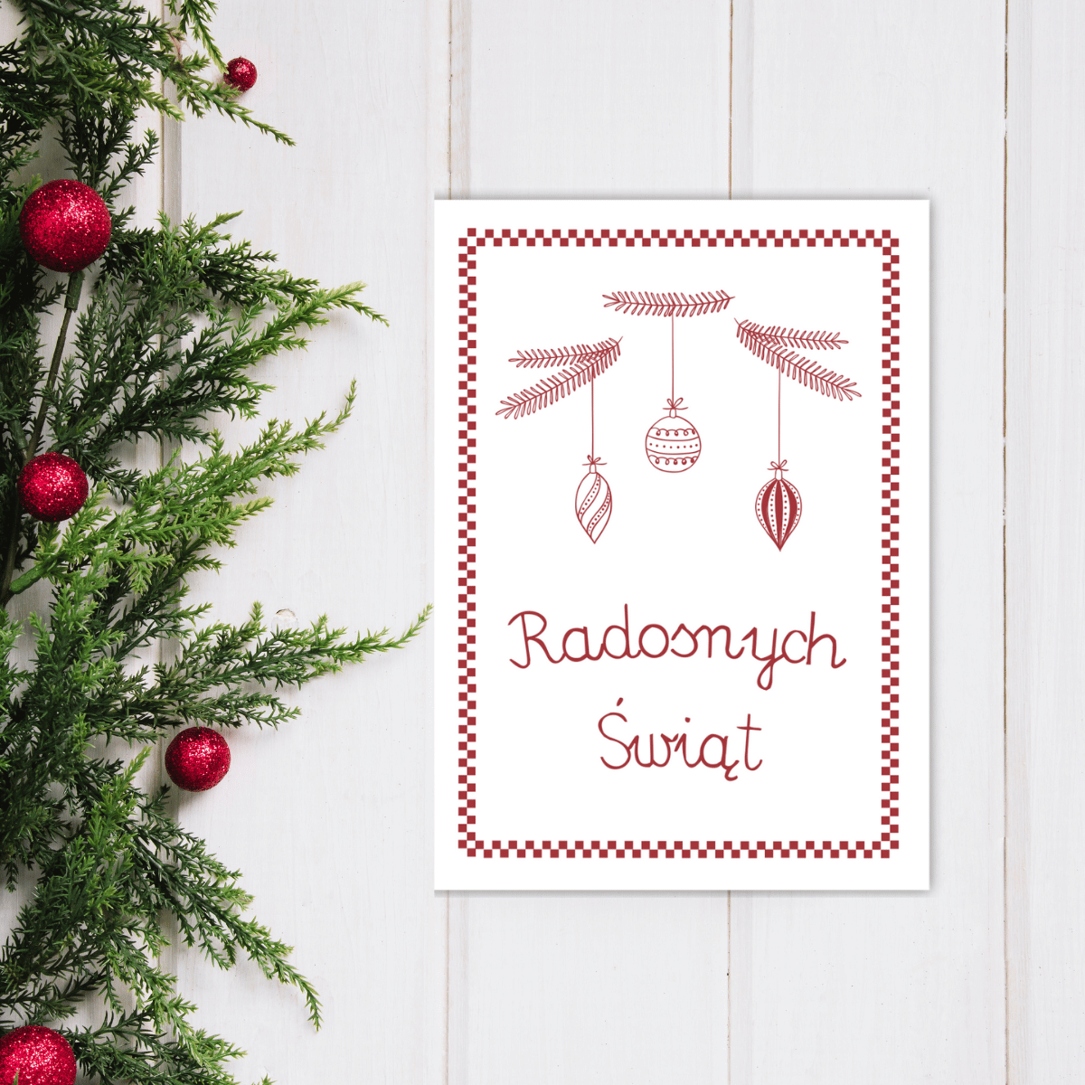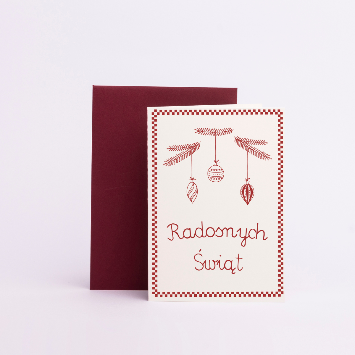Karnet uradować może każdego, rodziców, przyjaciół, znajomych, albo dalekiego krewnego. Ciepłe życzenia ręcznie wypisane, prawdziwą radość sprawią w takiej oprawie podarowane. Czerwoniasty kolor, dawna czcionka na makatki modłę w towarzystwie strojnych bombkami powieszonych na jodłę.