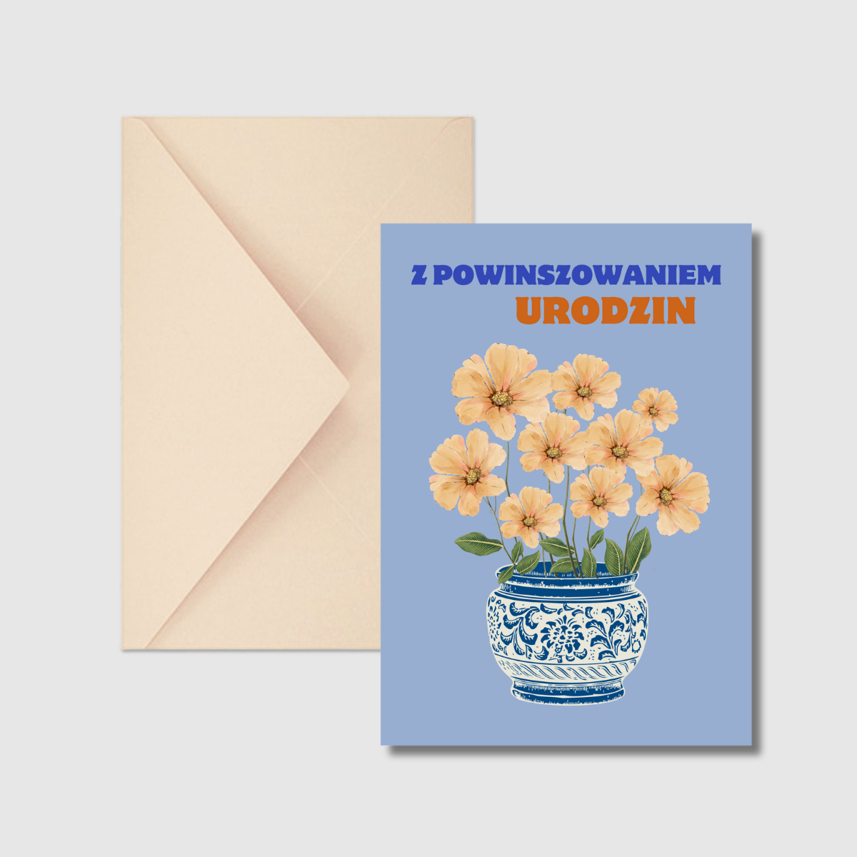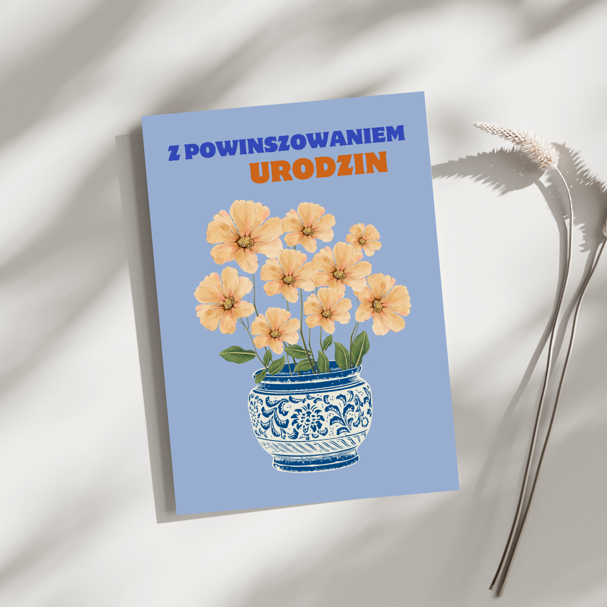 Karnet urodzinowy, prosty, kwiatami usłany, bo kwiat podarkiem powszechnym, każdemu dobrze znanym. Urodziny od pokoleń się winszuje, więc doniczka w starawym stylu króluje. Dziś się życzy i składa życzenia, kiedyś się winszowało i jakby święto większej rangi nabierało. “Z powinszowaniem” to forma niegdyś przesławna, z kunsztownym wydźwiękiem, uroczysta, a teraz z lekka zabawna.