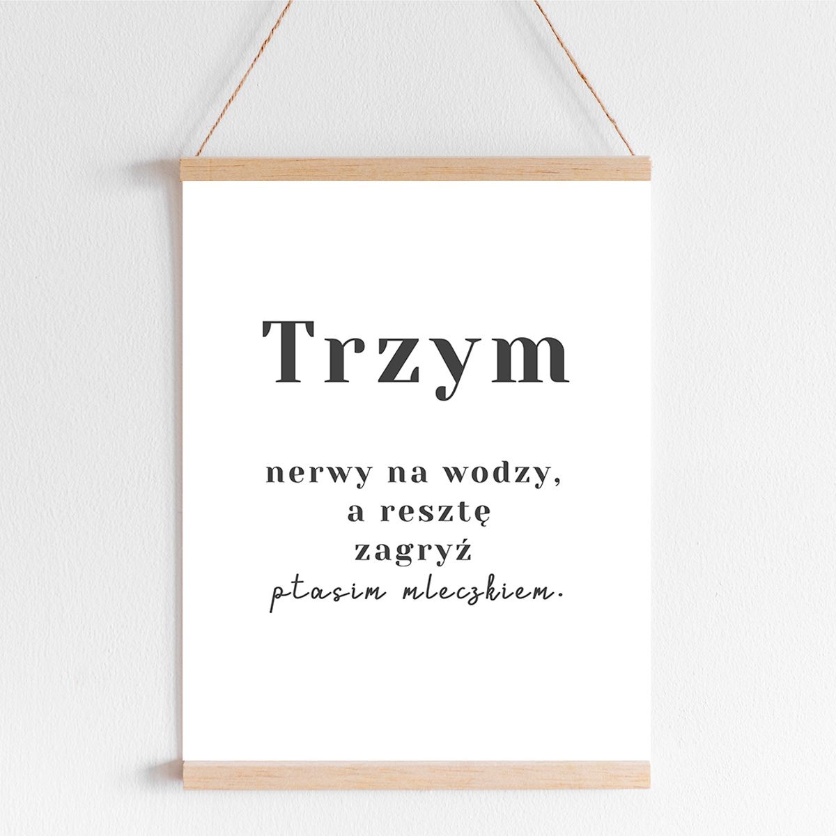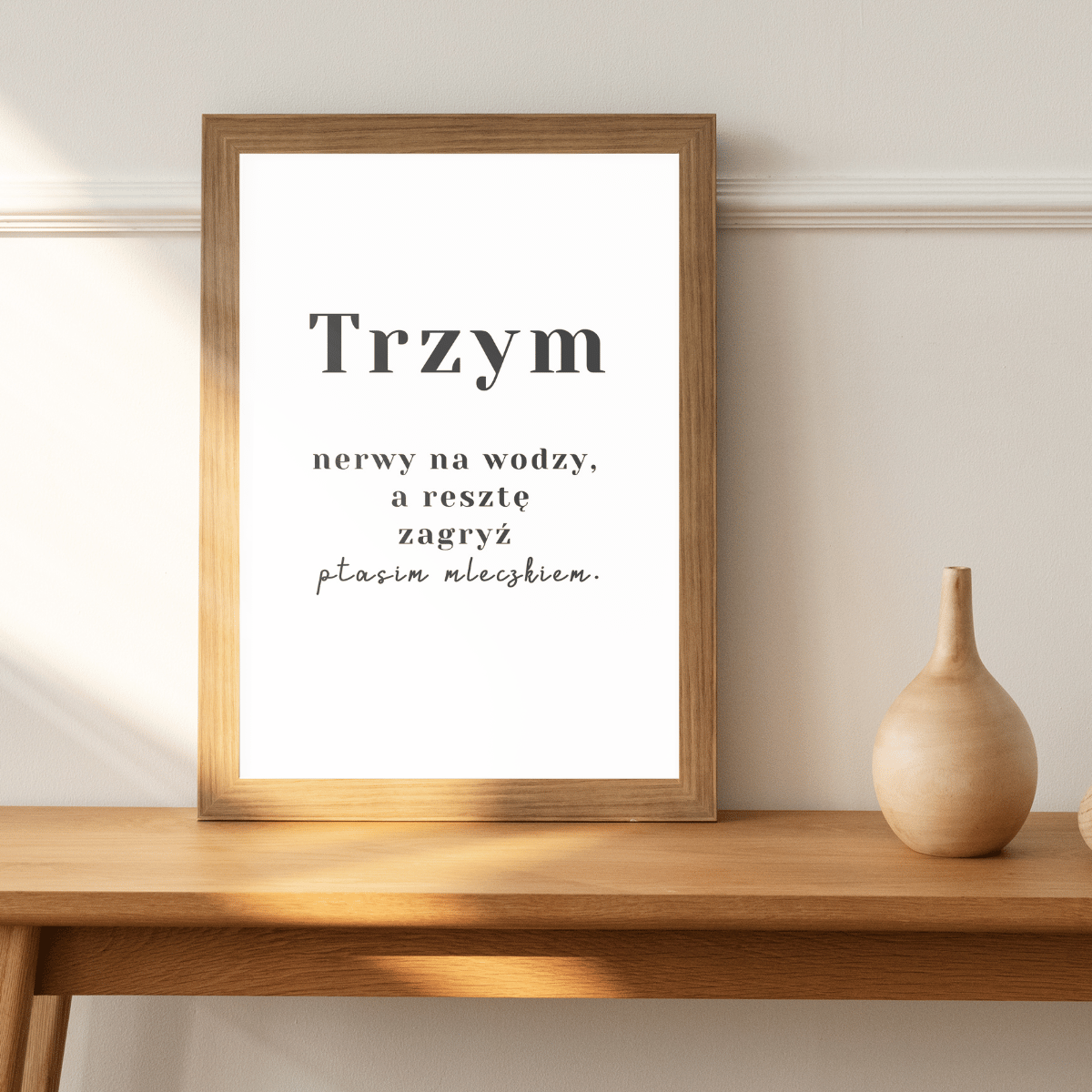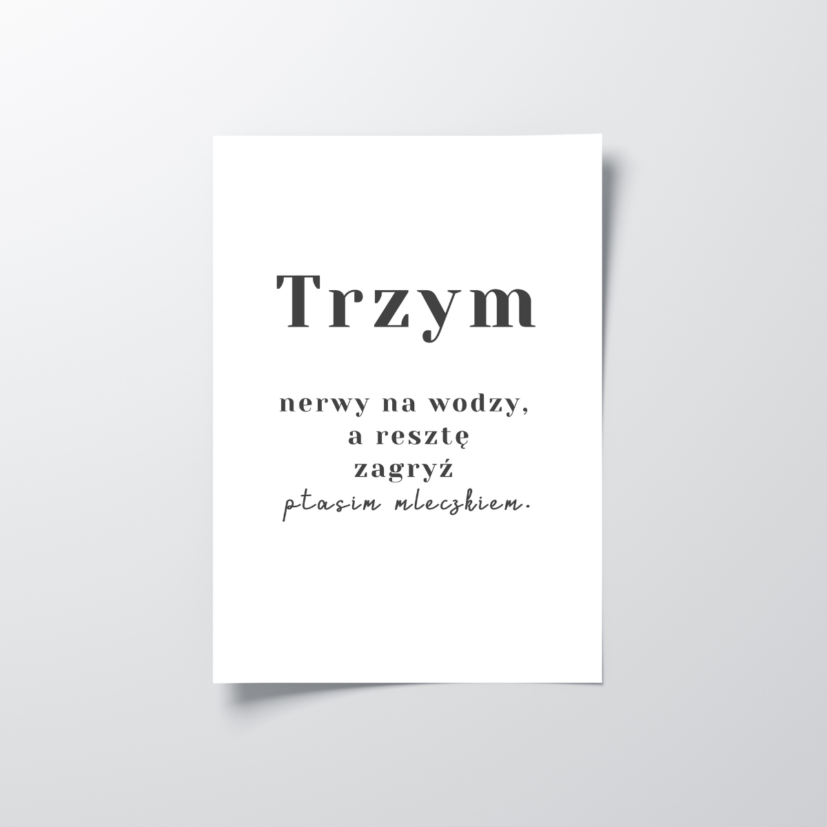 Plakat “Trzym nerwy” jest rozwiązaniem, kiedy cierpliwość jest wielkim wyzwaniem. Niezależnie od okazji, czy urodziny, czy święta, a nawet Dzień Matki, minimalistyczny poster zachwyci każdego nerwuska. Chociaż też nie zaszkodzi, jeśli taka prosta grafika z mądrą treścią zawiśnie na ścianie w kuchni, salonie, biurze, czy w pokoju taty, ciotki, babci, dziadka, kuzyna i córki. Wydrukowany na wysokiej jakości papierze (Nautilius Classic 250 g dla formatu A3, dla pozostałych Munken Lynx 300g) plakat w jednym stonowanym kolorze będzie idealnie pasował do każdego wnętrza. Upiększ swoje cztery kąty typograficznym plakatem i zaintryguj gości nietuzinkową dekoracją z mądrym przesłaniem.