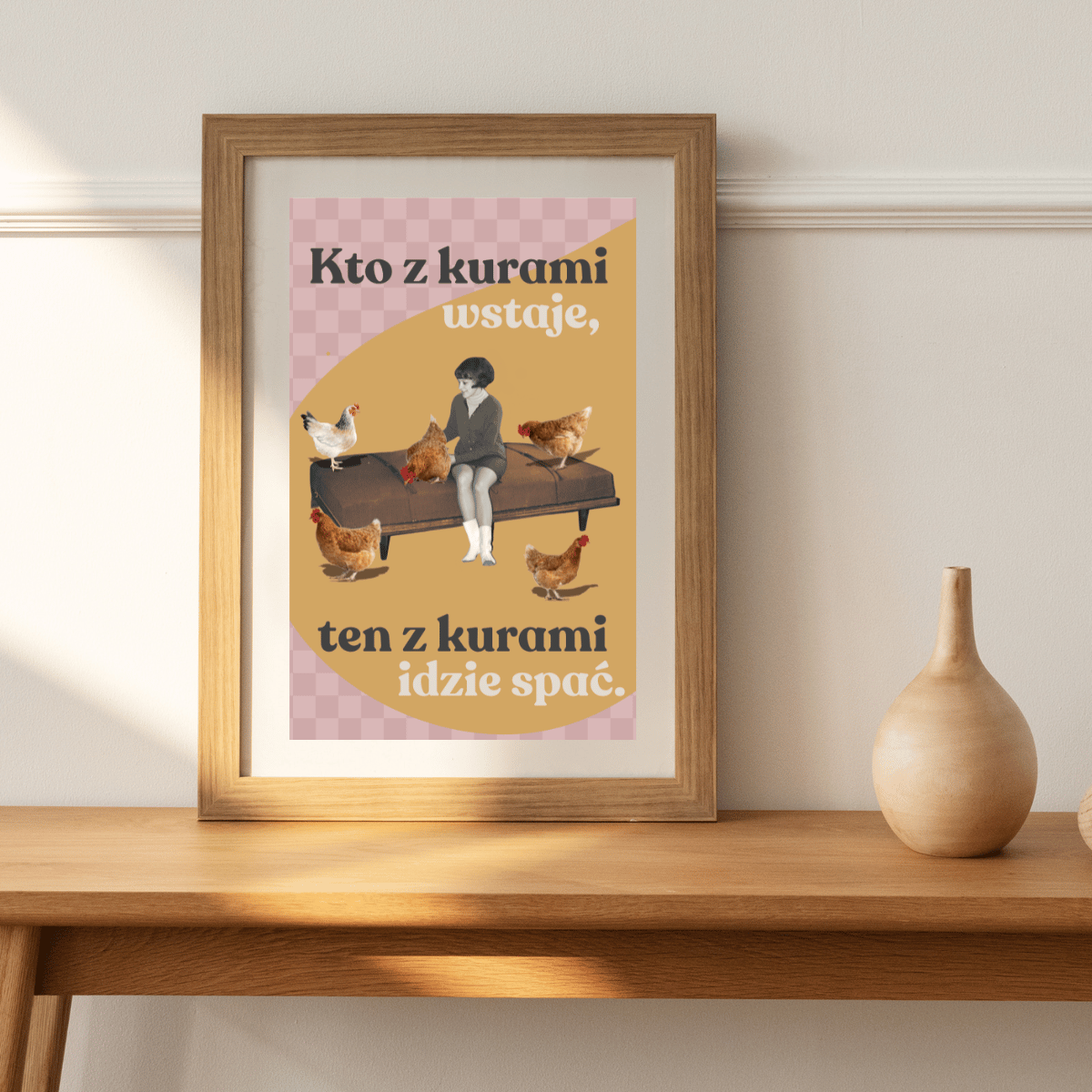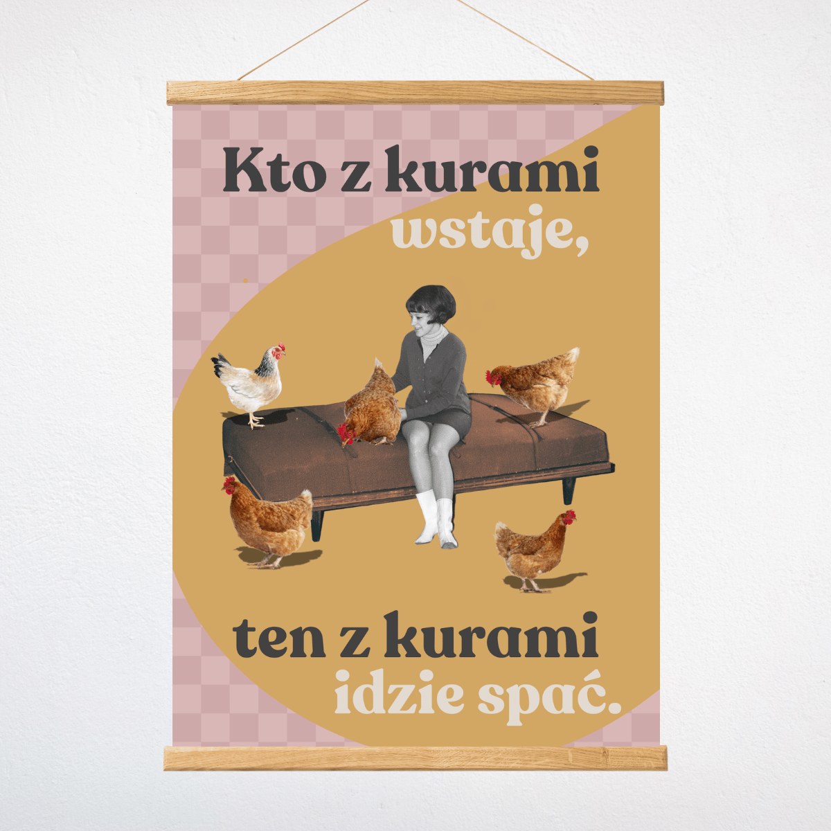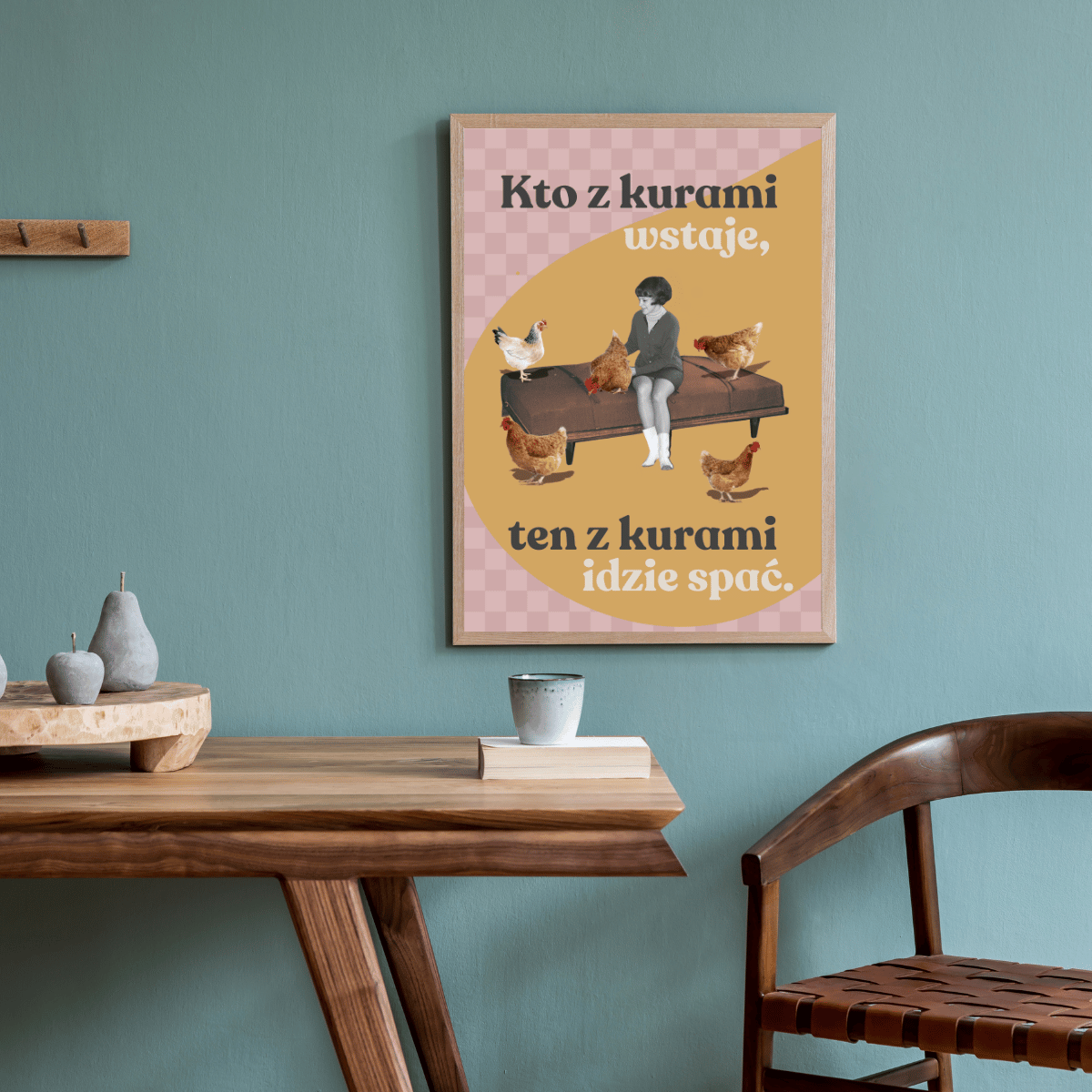 Na wsi koguta pianie to pierwsze, co słychać, kiedy słońce wstanie. Więc idealnym dla rannych ptaszków podarunkiem będzie plakat z kur wizerunkiem. Przecież gdy ktoś wcześnie z łóżka wychodzi, że z kurami się mówi, takie przysłowie za popularne uchodzi. Do tego sielskością i świeżością takie przedstawienie graficzne wionie, choć już w nieco odświeżonej ten plakat odsłonie. W pionie, z ciekawą czcionką, kolorami i wzorami iście z PRL-owskich czasów, metodą kolażu stworzone, by oddać charakter ozdób, które wtedy były we wnętrzach wywieszone. W każdym pomieszczeniu taki poster cudnie się zaprezentuje, czy w nowym, czy starym domu czy mieszkaniu się go wyeksponuje.