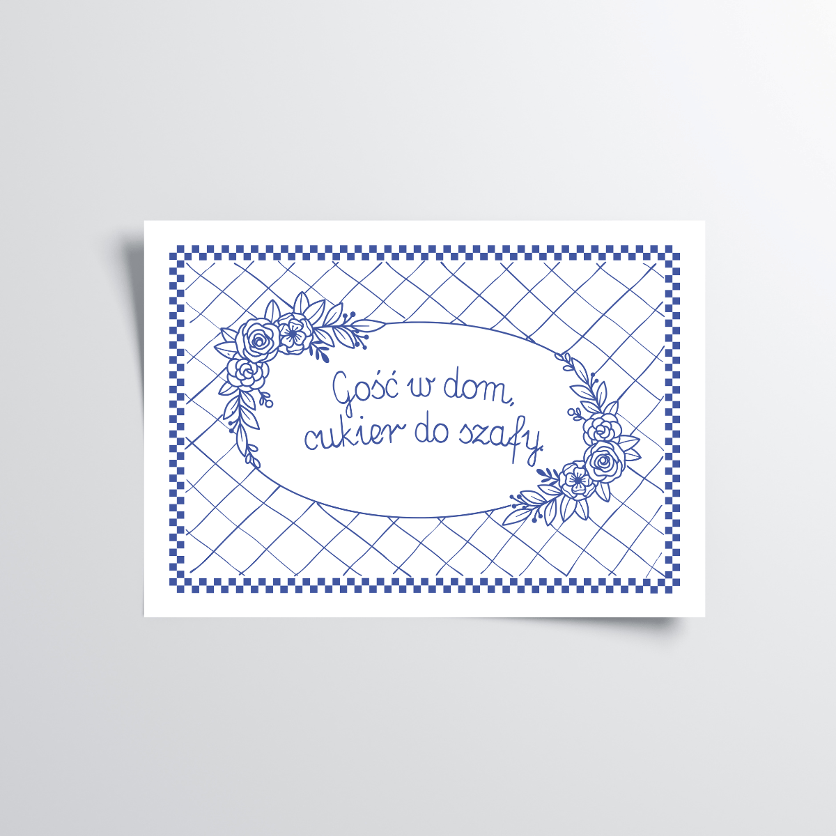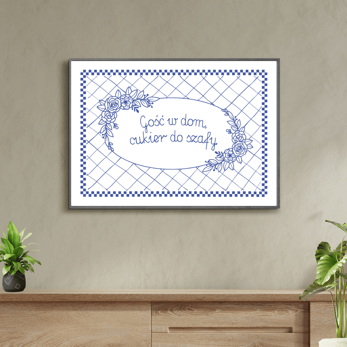 Od zawsze Gość w dom, Bóg w dom się mawiało, gdy już od bramy przybywających się witało. Choć już rzadziej dawne mądrości wygłaszamy, to ciągle w pamięci je odtwarzamy. Na makatkach wyszyte, nigdy nie uleciały, bo nad piecem w babcinej kuchni o sobie przypominały. Dzisiaj, ciągle zakorzenieni jesteśmy w staropolskiej gościnności, cieszymy się, gdy wypełniamy gospodarza powinności. Ale że czasy znacznie się zmieniły, to i na plakacie a’la makatce, troszkę inne mądrości zagościły. Nie powiedział nikt, że pół żartem pół serio nie można makatki przygotować, ona swoje funkcje i tak będzie sprawować. Oko ucieszy, uśmiech wywoła i wspomnienia o odwiedzinach u babci wzbudzić zdoła.